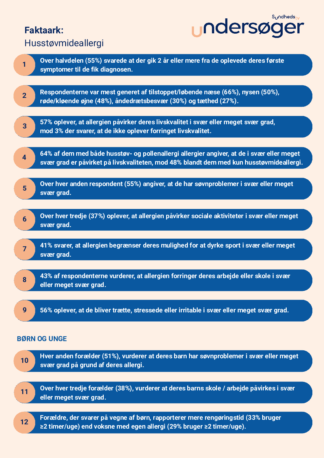 Formålet er at få et nuanceret indblik i, hvordan allergien mærkes i dagligdagen: fra søvn, skole og arbejde til sociale aktiviteter og generel trivsel. Undersøgelsen giver værdifuld viden om de udfordringer, som både børn og voksne lever med – og kan dermed være med til at sætte fokus på behovet for bedre sygdomsforståelse og behandling.
